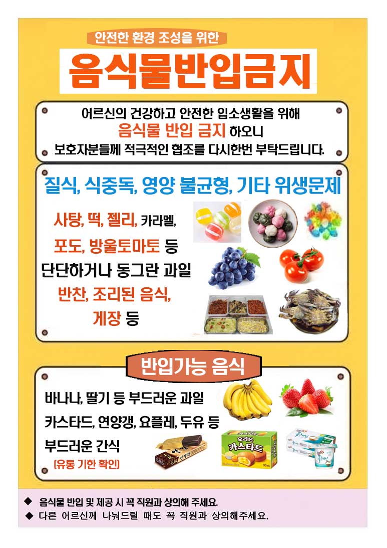 어르신들의 건강하고 안전한 입소생활을 위하여 외부음식물 반입 금지하오니 다시한번 보호자분들의 적극적인 협조와 이해부탁드립니다. 부득이하게 반입가능 이외 음식물을 반입해야하는 경우 반드시 사무실로 문의하시어 안내받으시기 바랍니다. 감사합니다. 문의전화 061-834-0402 ![]() |